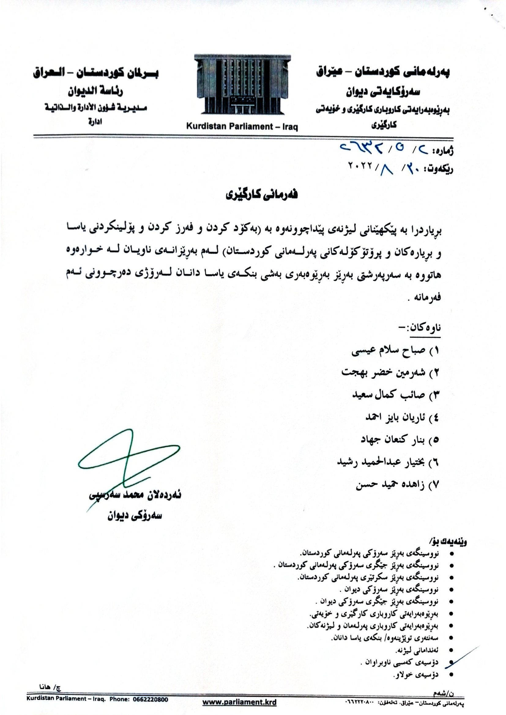 1. به‌ فه‌رمانی به‌ڕێز سه‌رۆكی په‌رله‌مانی كوردستان، لیژنه‌یه‌ك له‌ نۆ ڕاوێژكاری یاسایی په‌رله‌مان پێكهێنرا، لیژنه‌كه‌ كاری پێداچوونه‌وه‌ و به‌راوردكردنی یاساكان بوو، بۆ ئه‌وه‌ی پرۆسه‌كه‌ به‌ شێوازێكی دروست به‌ڕێوه‌ بچێت و هه‌ر یاسایه‌ك ورد و دروست له‌ بنكه‌ی یاسادانان‌ تۆمار نه‌كرێت.